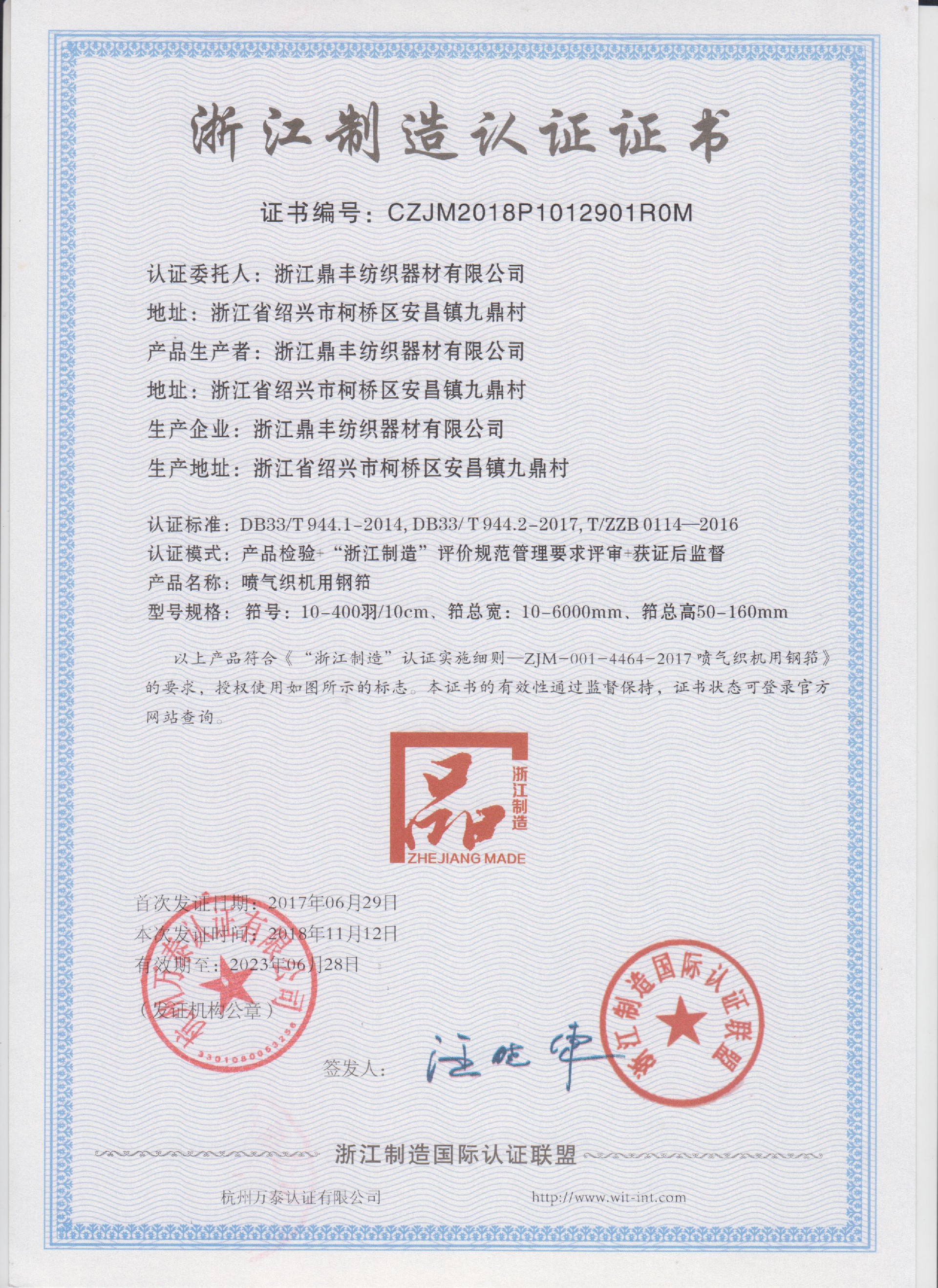 浙江鼎豐紡織器材有限公司始建于1986年,是一家專業(yè)生產(chǎn)各類無梭織機(jī)用鋼筘:噴氣筘、噴水筘、劍桿筘、其他類型鋼筘;鋁合金綜框、鋼片綜、停經(jīng)片、經(jīng)軸、織軸、卷布輥等產(chǎn)品及配件的民營企業(yè)。